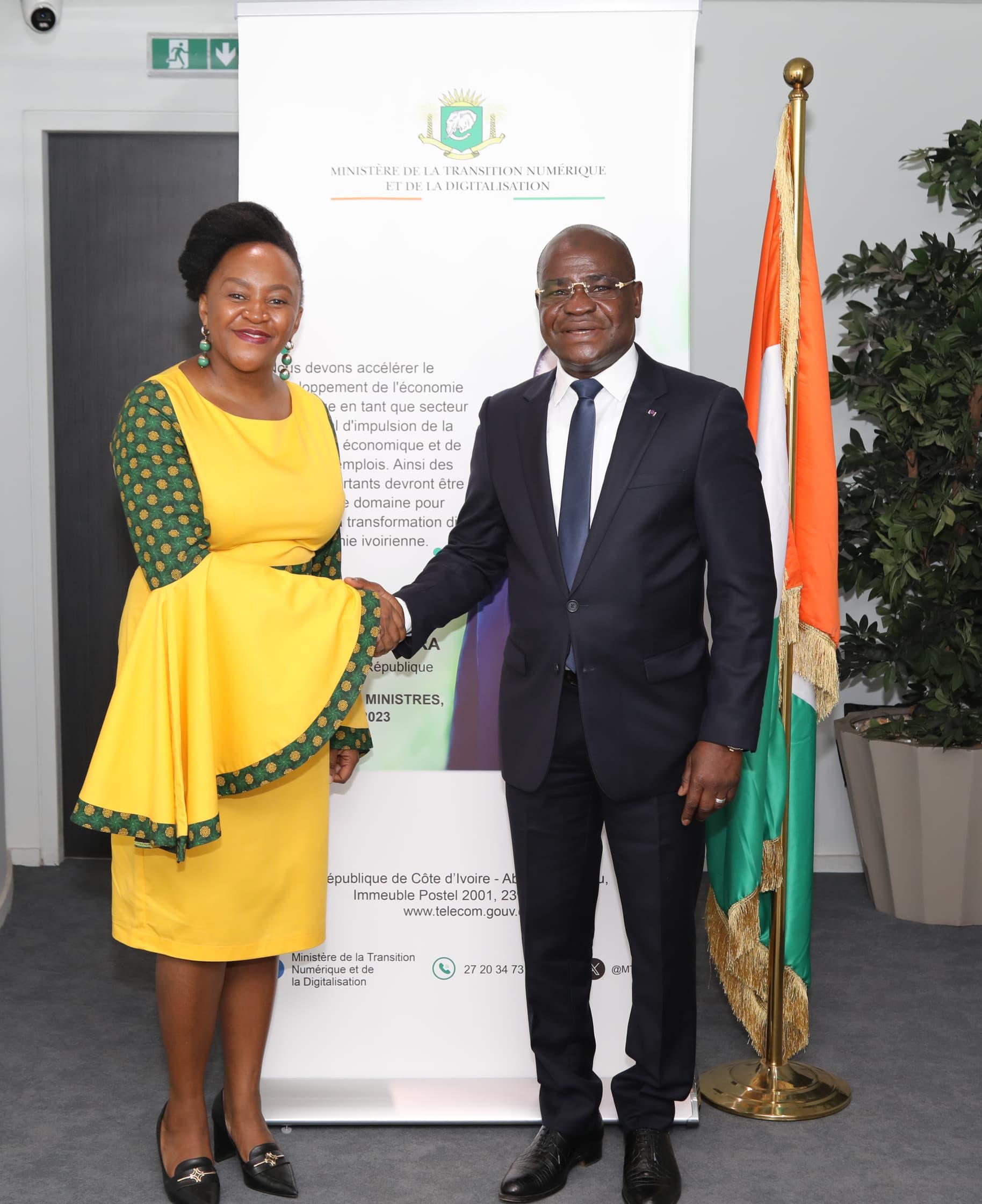 Accompagné par son prédécesseur M. Djibril Ouattara, Mme N’Gambi a échangé avec le ministre Kalil Konaté sur les problématiques du secteur des télécommunications.