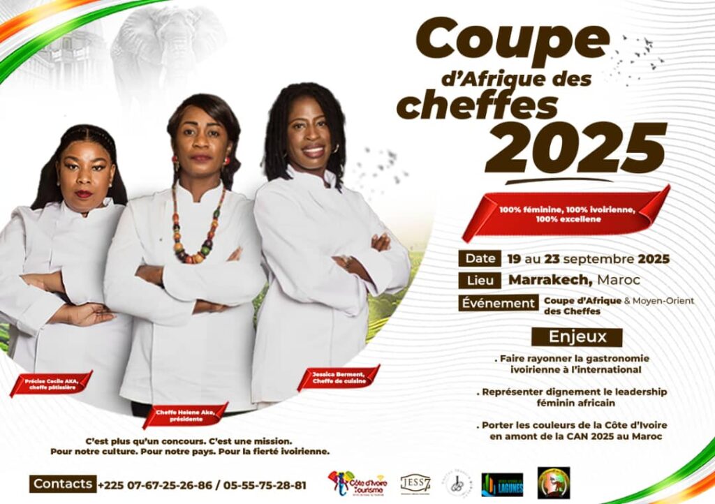 Trois femmes dynamiques et courageuses défendront avec brio, créativité et ingéniosité les couleurs de la Côte d’Ivoire , lors de la Coupe d’Afrique et Moyen-Orient des Cheffes Culinaires, également appelée Morjane Halima, qui se tiendra du 19 au 23 septembre prochain à Marrakech, au royaume chérifien.