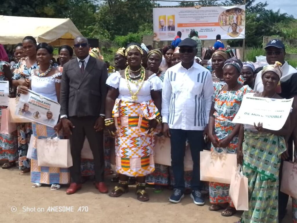 Dans le même esprit de solidarité, plus de 200 pagnes ont été remis aux femmes de Molonoublé et des 43 villages environnants. Ces dons symboliques témoignent de la reconnaissance du rôle central qu’elles jouent dans la vie sociale, scolaire et politique de la communauté. Les responsables de villages, leurs adjointes ainsi que plusieurs femmes leaders engagées dans le développement local ont été particulièrement mises à l’honneur.