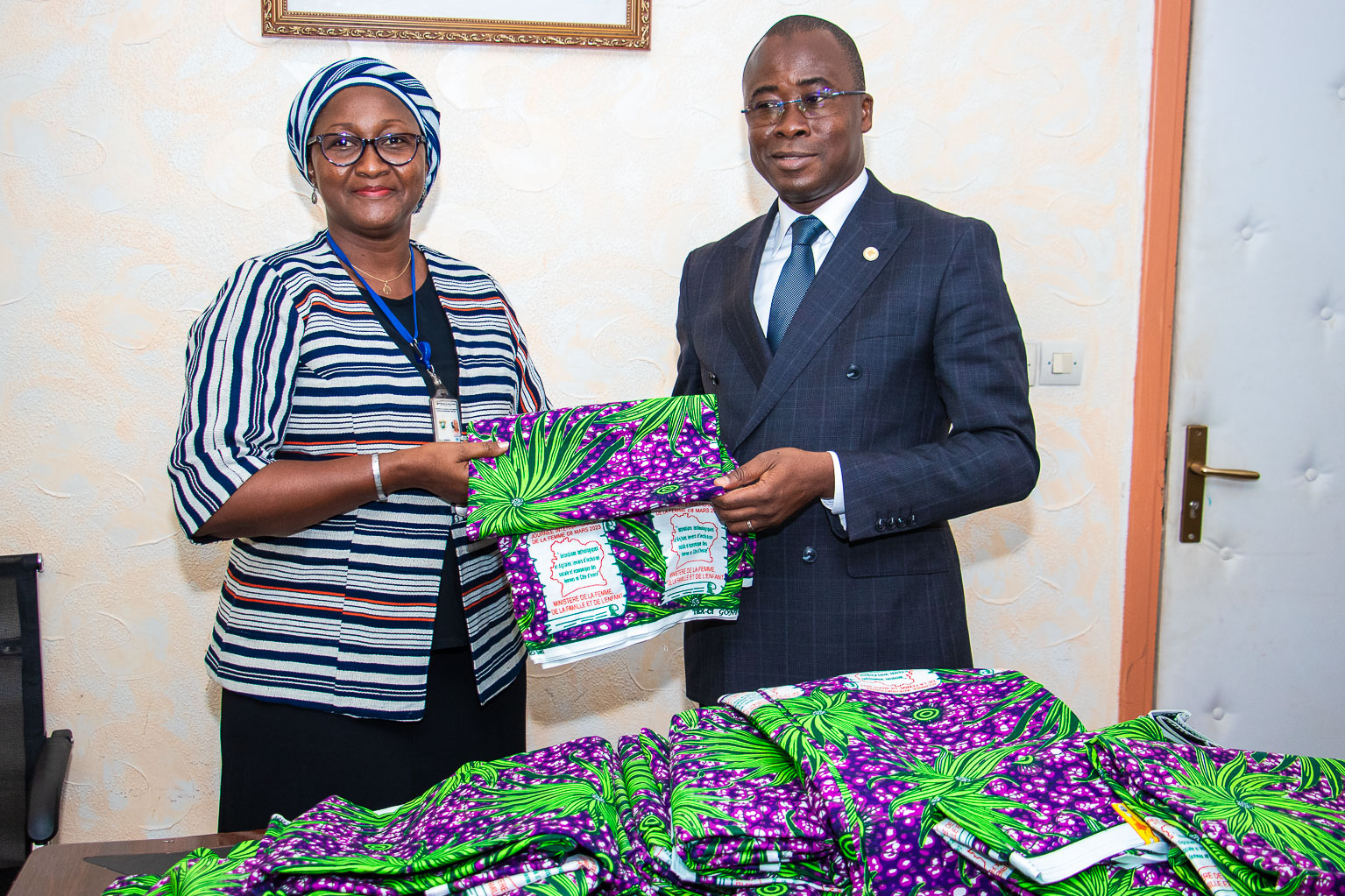 La cérémonie de remise s’est déroulée ce mardi 15 février 2023, à la salle de conférences de ladite Direction. Ainsi, de façon symbolique, il a remis à Madame KOMARA Constance Mariam, Sous-Directeur de la Formation, représentant l’ensemble des femmes de ladite Direction, un complet du pagne édité par le Ministère de la Femme, de la Famille et de l’Enfant à l’occasion de cette importante cérémonie.