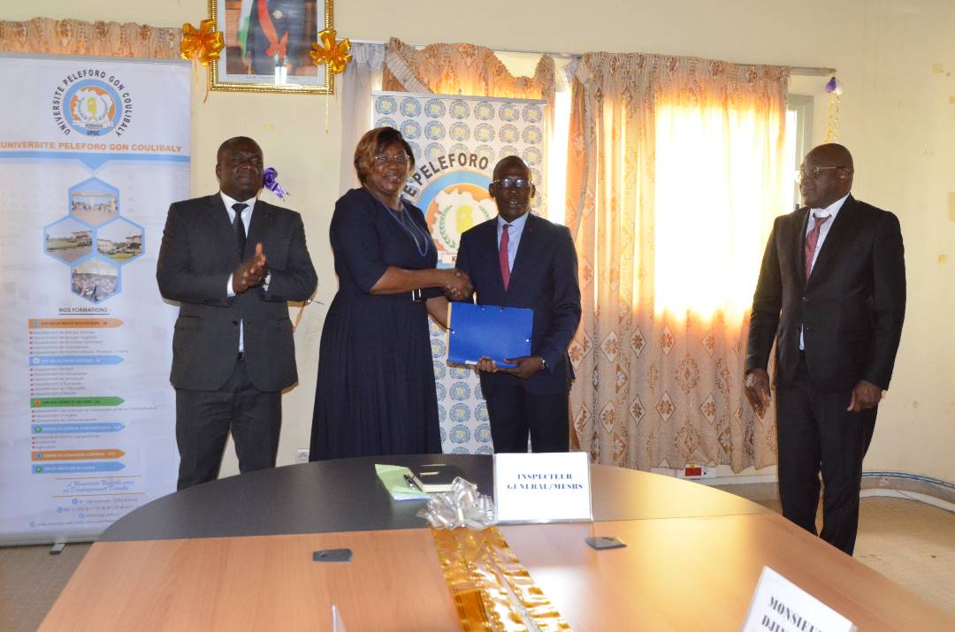 Nommée à la tête de l’Université Peleforo GON COULIBALY récemment, Professeure Aoua Sougo COULIBALY a pris ses fonctions ce lundi 10 juillet 2023. La cérémonie de passation de charges avec le Président sortant a eu lieu à la salle de Conseil de ladite Université, en présence de l’Inspecteur Général de l’Enseignement Supérieur, Professeur YAPI Houphouët Félix, de Dr FOFANA Alhassane, Directeur des Ressources Humaines du Ministère de l’Enseignement Supérieur et de la Recherche Scientifique et de l’ex DRH dudit ministère, Monsieur Djimbala DIAKITÉ. C’est le Professeur YAPI Houphouët Félix qui a ouvert la cérémonie en sa qualité d’officiant en situant le contexte, avant de passer la parole au Professeur COULIBALY Adama pour son mot de bienvenue. Dans son propos, le Président de l’UPGC sortant, tout en louant le Créateur pour avoir permis la tenue de cette cérémonie, a rendu un hommage appuyé à ses collaborateurs pour leur engagement à ses côtés et les sacrifices consentis dans l’exécution de leurs tâches pendant la décennie passée à la tête de l’UPGC. Au Ministre Adama DIAWARA, il a témoigné toute sa gratitude et son infinie reconnaissance pour la confiance placée en lui, sans oublier les autorités politiques, administratives, religieuses et traditionnelles de la ville de Korhogo pour leur soutien et leur accompagnement constants durant ces années. Professeur COULIBALY Adama a terminé son propos en souhaitant plein succès à la nouvelle Présidente dans l’accomplissement de sa mission, non sans lui assurer sa disponibilité pour d’éventuelles assistances en cas de nécessité ou de besoin.