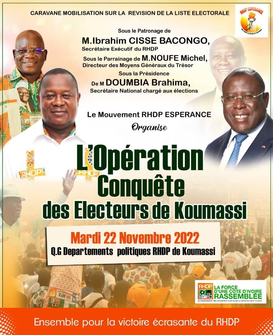 Pour permettre à son parti politique d’avoir le maximum d’inscrits sur le listing électoral, le Directeur des Moyens généraux du Trésor et de la Comptabilité Publique, par ailleurs Secrétaire Départemental RHDP de Bouna-ZKB dans la région du Bounkani, le Docteur Michel Noufé s’est mis au service du Mouvement RHDP ESPERANCE qui a initié une caravane baptisée « opération conquête des électeurs ». Depuis le lundi 21 novembre cette caravane sillonne les ménages à l’aide des mégaphones et de camion-podium pour appeler les jeunes majeurs et les non –inscrits en vue de se faire enrôler. Parrainé par le DR Michel Noufé et avec le soutien politique des membres de la direction du RHDP dont la Ministre d’Etat Mme Kandia Camara, le Président de l’Assemblée Nationale, Adama Bictogo et le Secrétaire Exécutif du RHDP, le Ministre Cissé Bacongo , cette caravane a investi les communes d’Abobo, de Koumassi et de Yopougon dans une ambiance carnavalesque.
