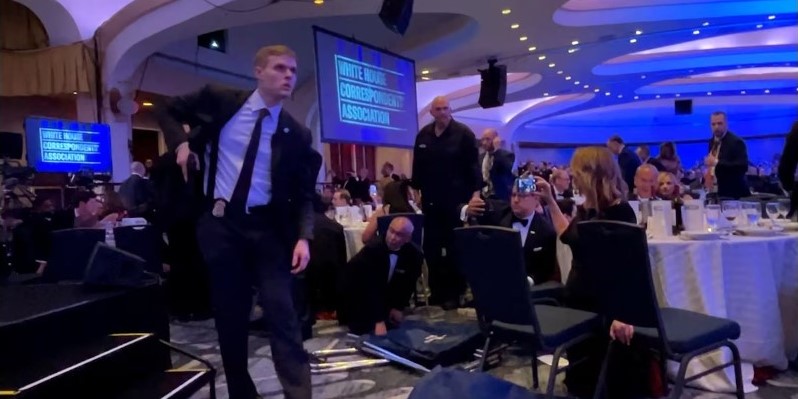 Le dîner des correspondants de la Maison-Blanche, auquel Donald Trump assistait pour la première fois en tant que président, venait à peine de commencer quand des coups de feu ont retenti à l’extérieur de la salle de réception de l’hôtel Hilton. Des agents du Secret Service ont immédiatement évacué le président et la première dame alors que les centaines d’invités, dont de nombreux correspondants des principaux médias américains, en robes longues et smokings s’abritaient sous les tables, criant notamment « À terre, à terre !»