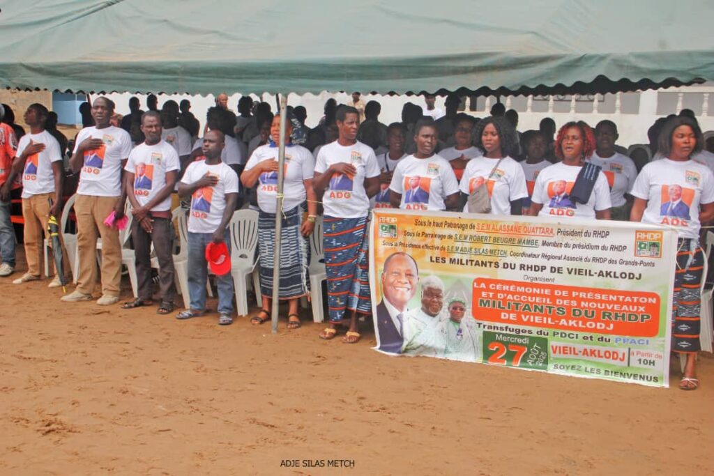 Le village de Vieil-Aklodj a vibré, ce mercredi 27 août, au rythme d’une cérémonie de présentation et d’accueil des nouveaux militants du Rassemblement des Houphouëtistes pour la Démocratie et la Paix (RHDP). Au total, 118 militants issus de l’opposition ont fait le choix d’intégrer la grande famille houphouëtiste, séduits par la vision de paix et de développement portée par le Président Alassane Ouattara et relayée sur le terrain par le ministre Adjé Silas Metch.